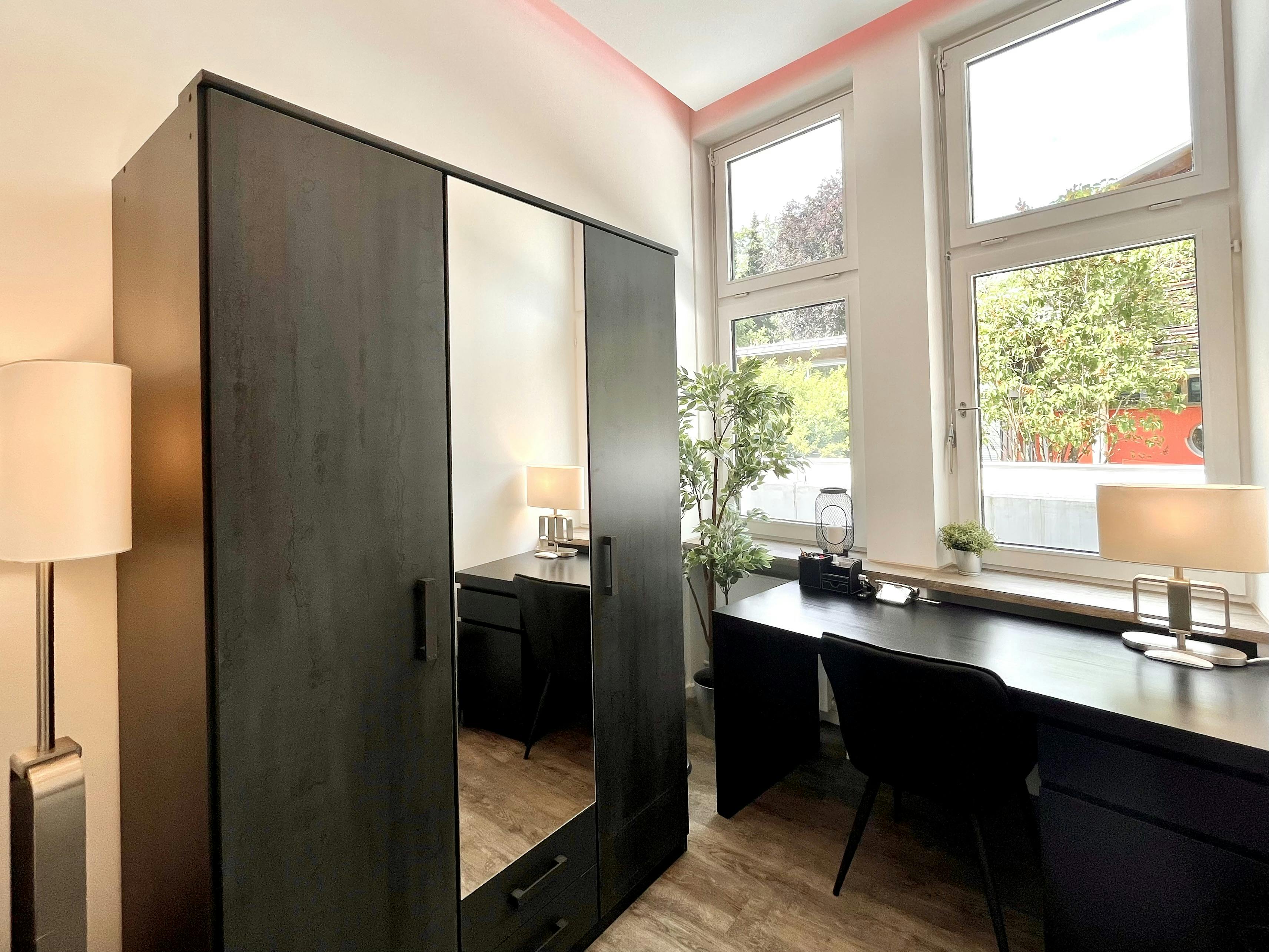 The newly and high-quality equipped room is part of a 112 sqm newly renovated apartment in Munich, Solln. Feel at home in the apartment and relax in the pool or sauna of the apartment complex or take a break in the garden enjoying a barbecue with your roommates. You can go on a virtual tour through the whole apartment: https://my.matterport.com/show/?m=rxtJ3EkaXz6 The comfortably furnished room has the following brand new furniture: - 90 cm bed with adjustable slats and medium-firm foam mattress with mattress protector - Large wardrobe - Desk with drawers and upholstered chair - Short pile carpet - Decorative wall pictures The table and floor lamps, plants, and office...