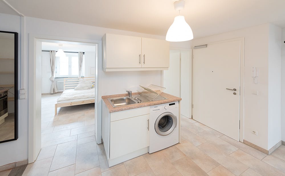 ROOM Our flats fulfil all your daily living requirements. Every flat comes readily equipped with a kitchen, including refrigerator, cooking equipment and dishes. Flats also include a washing machine and Wi-Fi Internet. Each room is fully furnished and offers a comfortable bed with fresh linen and a workspace. The area provides you with several shopping opportunities and excellent connections to public transport.