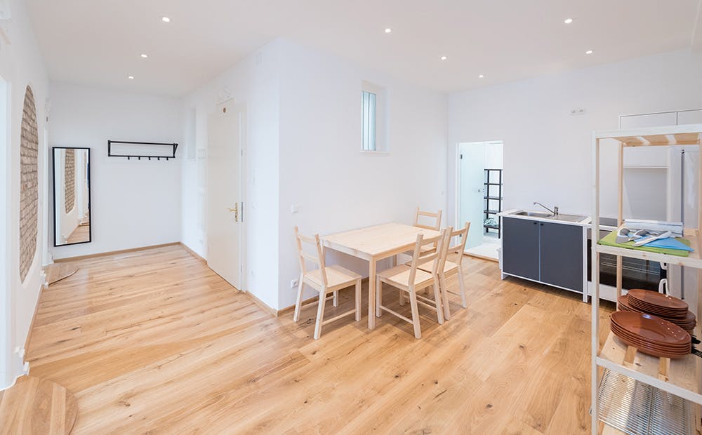 ROOM Our flats fulfil all your daily living requirements. Every flat comes readily equipped with a kitchen, including refrigerator, cooking equipment and dishes. Flats also include a washing machine and Wi-Fi Internet. Each room is fully furnished and offers a comfortable bed with fresh linen and a workspace. The area provides you with several shopping opportunities and excellent connections to public transport.