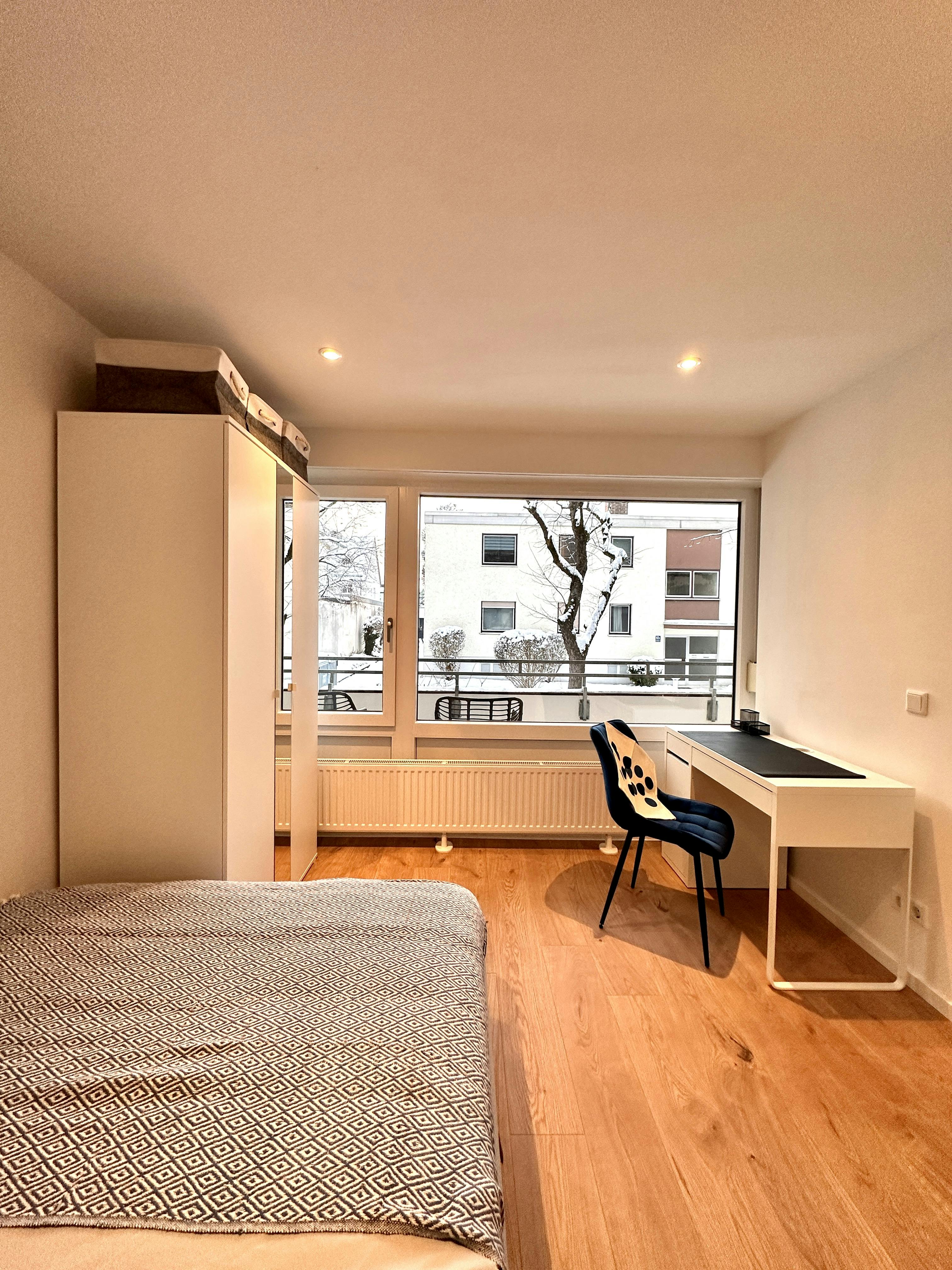 Room Description This cozy and modern private room offers a generous common area. The room is elegantly furnished with a comfortable bed, a large wardrobe, and a desk, providing ample space for both relaxation and productivity. Our shared apartments are the perfect opportunity for “newcomers” to Munich to quickly find their footing and build meaningful connections. Here, you’ll find not just a place to stay, but also a welcoming and vibrant community to be part of. Thanks to the relaxed and friendly atmosphere in our shared flats, settling in feels effortless. In our experience, everyone quickly finds their place—whether you’re new...