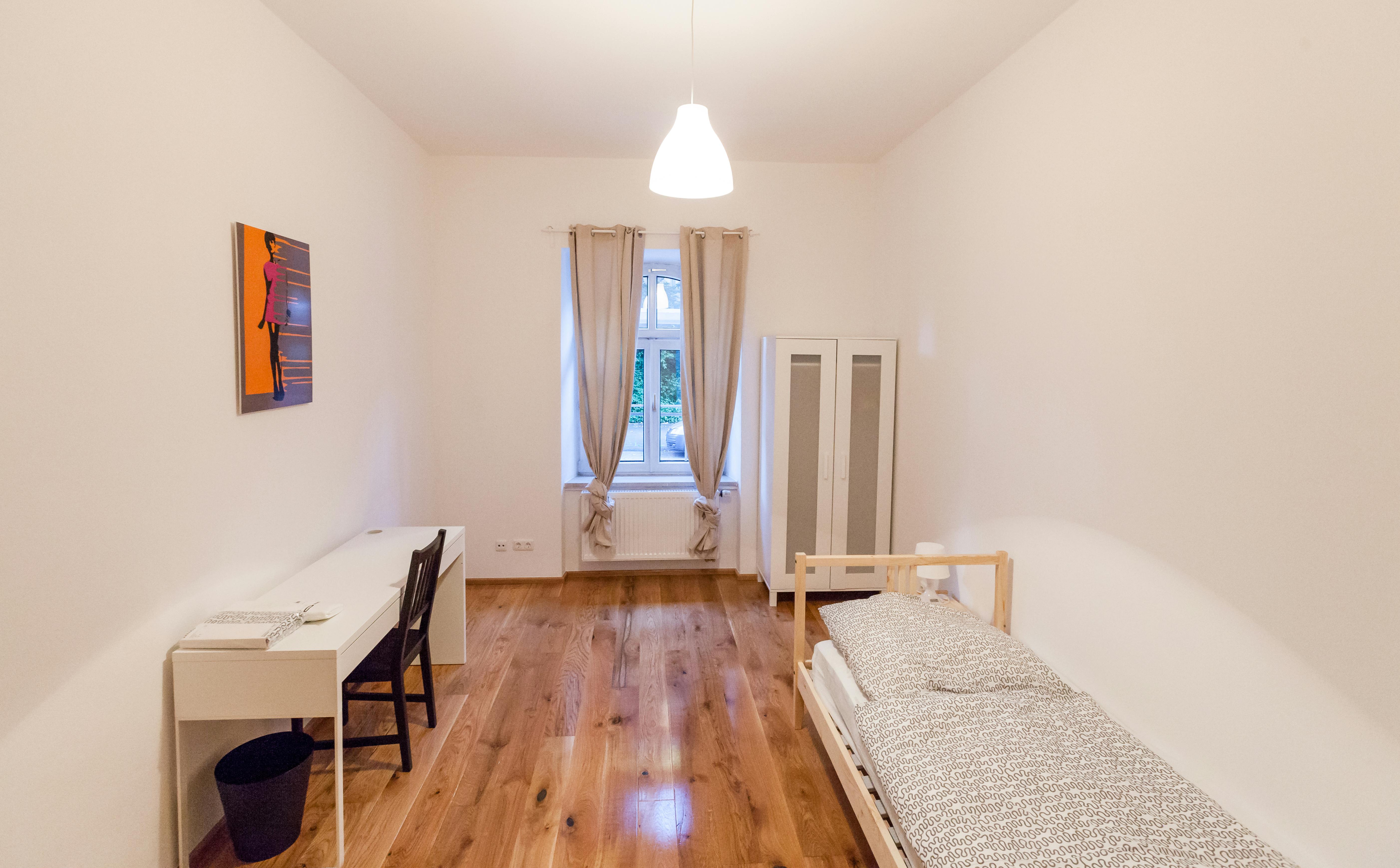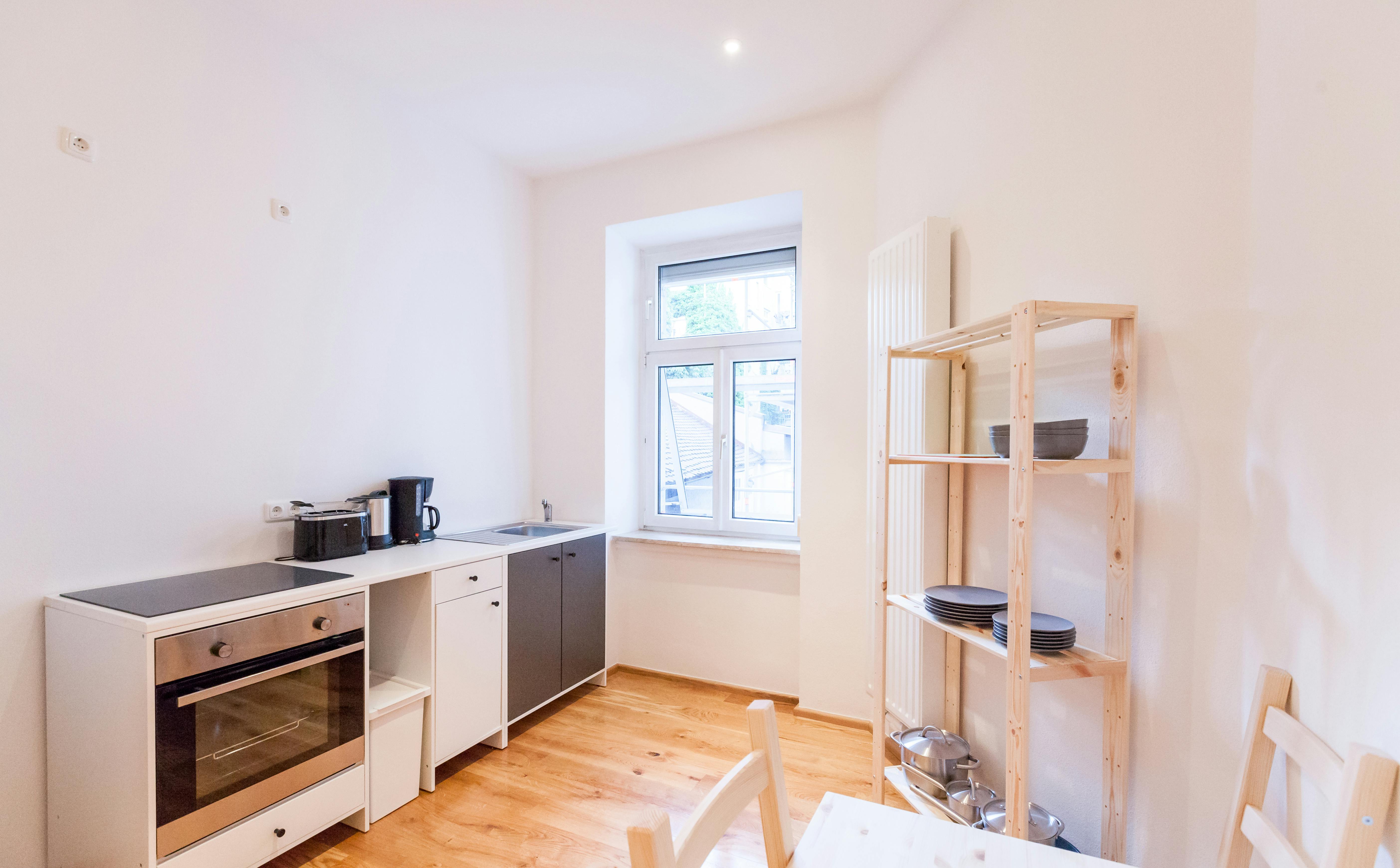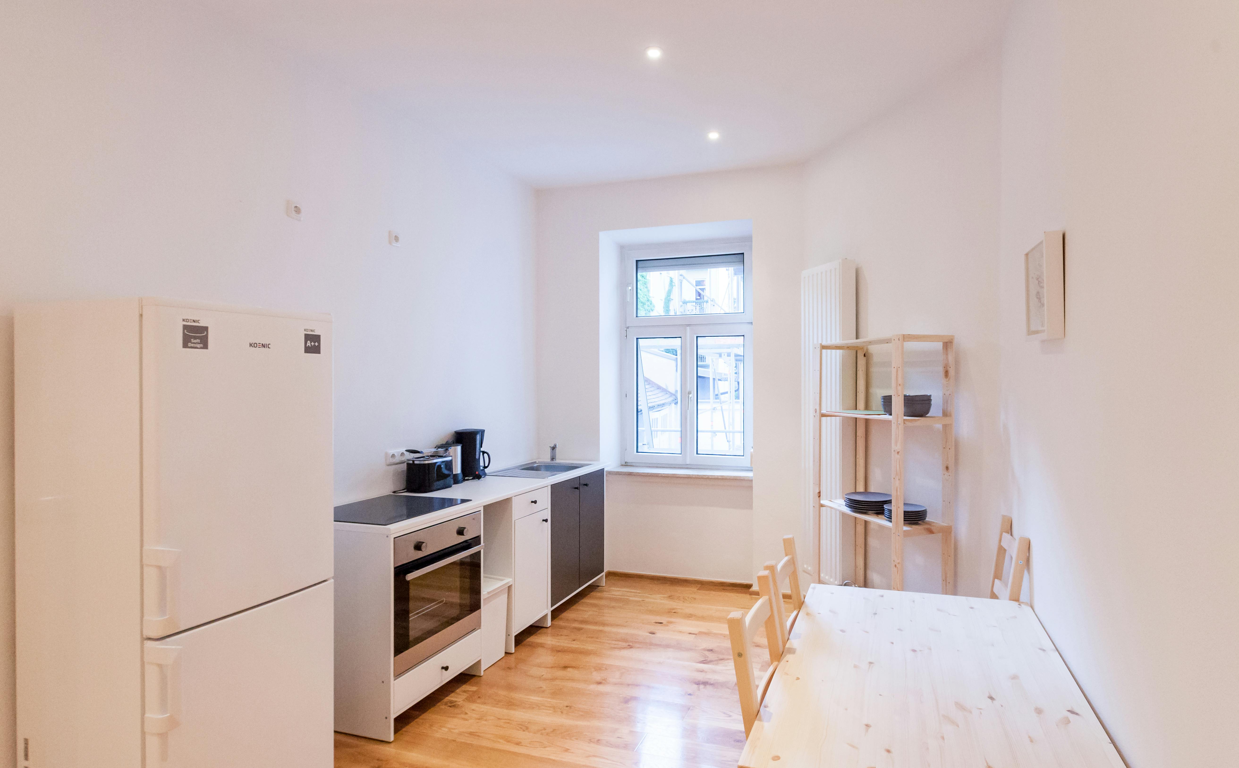 ROOM Our flats fulfil all your daily living requirements. Every flat comes readily equipped with a kitchen, including refrigerator, cooking equipment and dishes. Flats also include a washing machine and Wi-Fi Internet. Each room is fully furnished and offers a comfortable bed with fresh linen and a workspace. The area provides you with several shopping opportunities and excellent connections to public transport.