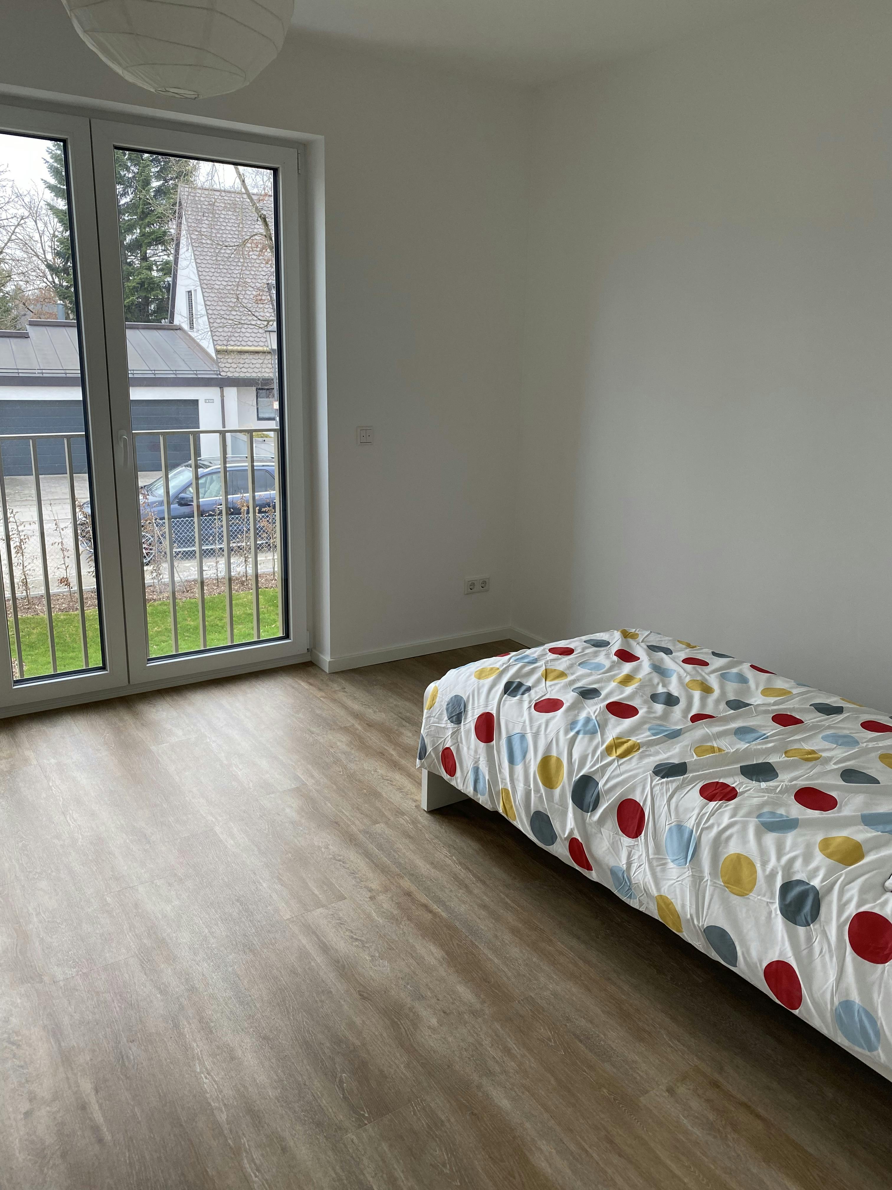 - Southeast of Munich - Between Ramersdorf and Perlach on Ottobrunnerstr. - Quite residential area with a big green garden - 1 minute walk to bus station - Edeka & Bakery just across the street - House with garden in a residential complex - Sunshine all day coming from south and east