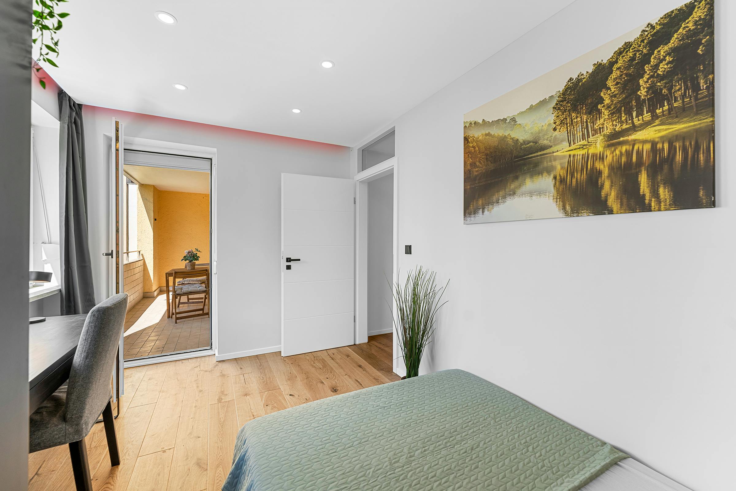 The newly and high-quality equipped room (Room 1) is part of an 90 sqm freshly renovated apartment in Munich-Feldmoching-Hasenbergl, with balcony. The generous hallway gives a very inviting impression and provides access to all rooms of the large apartment. The apartment also has a newly furnished bathroom, with a washbasin and LED mirror, a towel radiator, a shower, a washing machine, a dryer and a toilet. The comfortably furnished room has the following brand-new furniture: - 140cm Bed with mattress - Large wardrobe with drawers - Desk with drawers and upholstered chair - inclusive balcony The kitchen offers all imaginable conveniences: - All kitchen equipment such as...