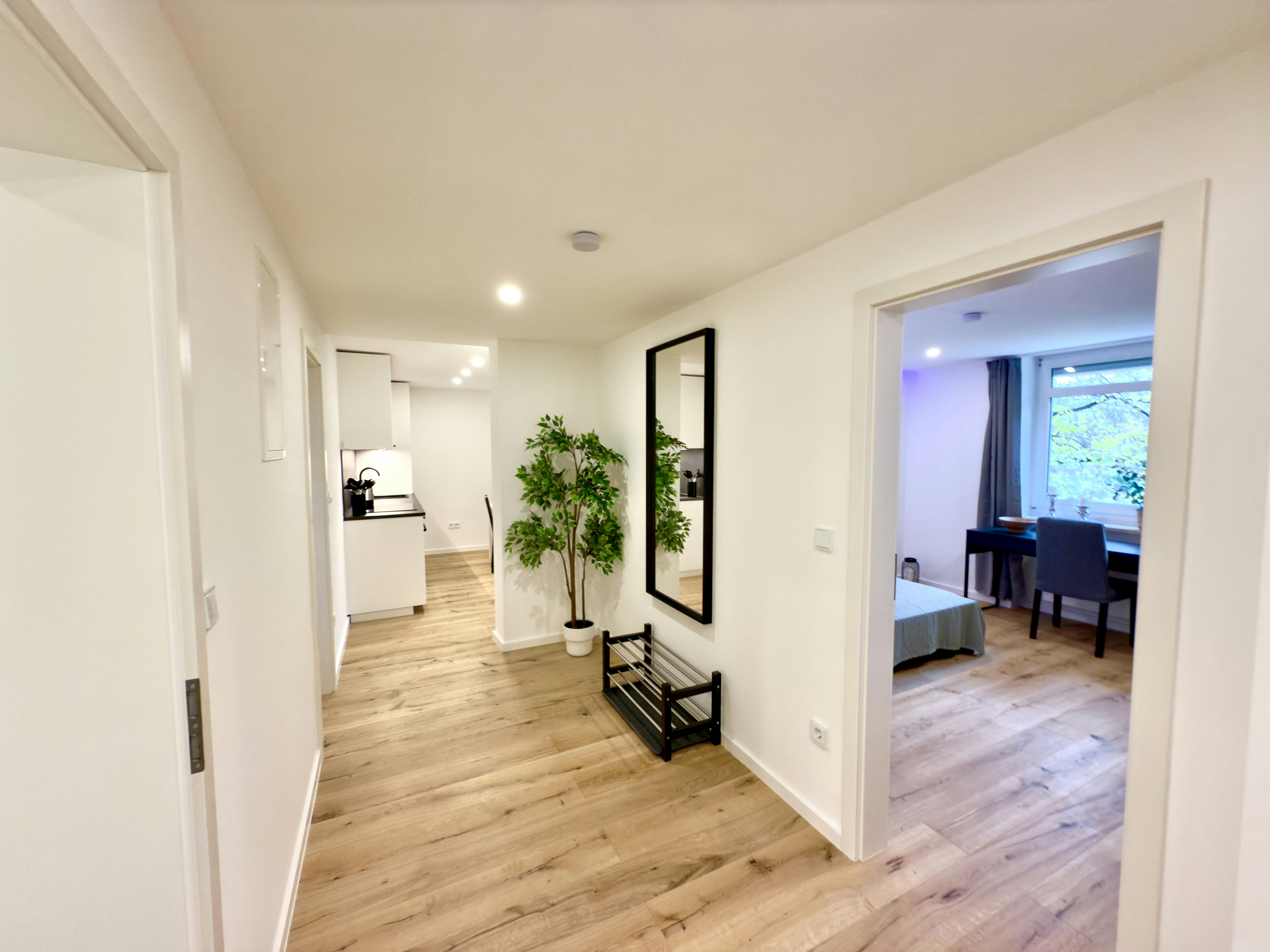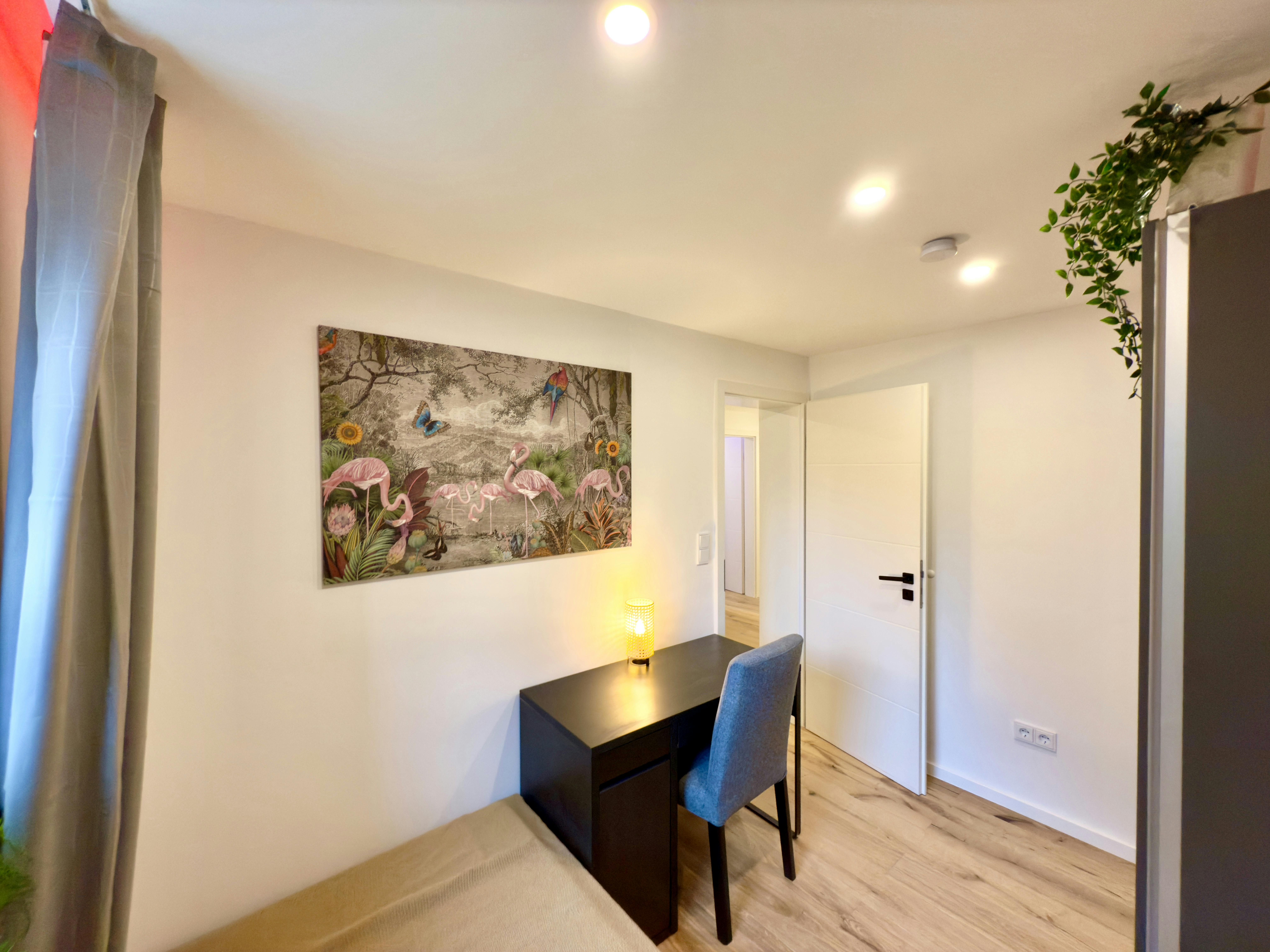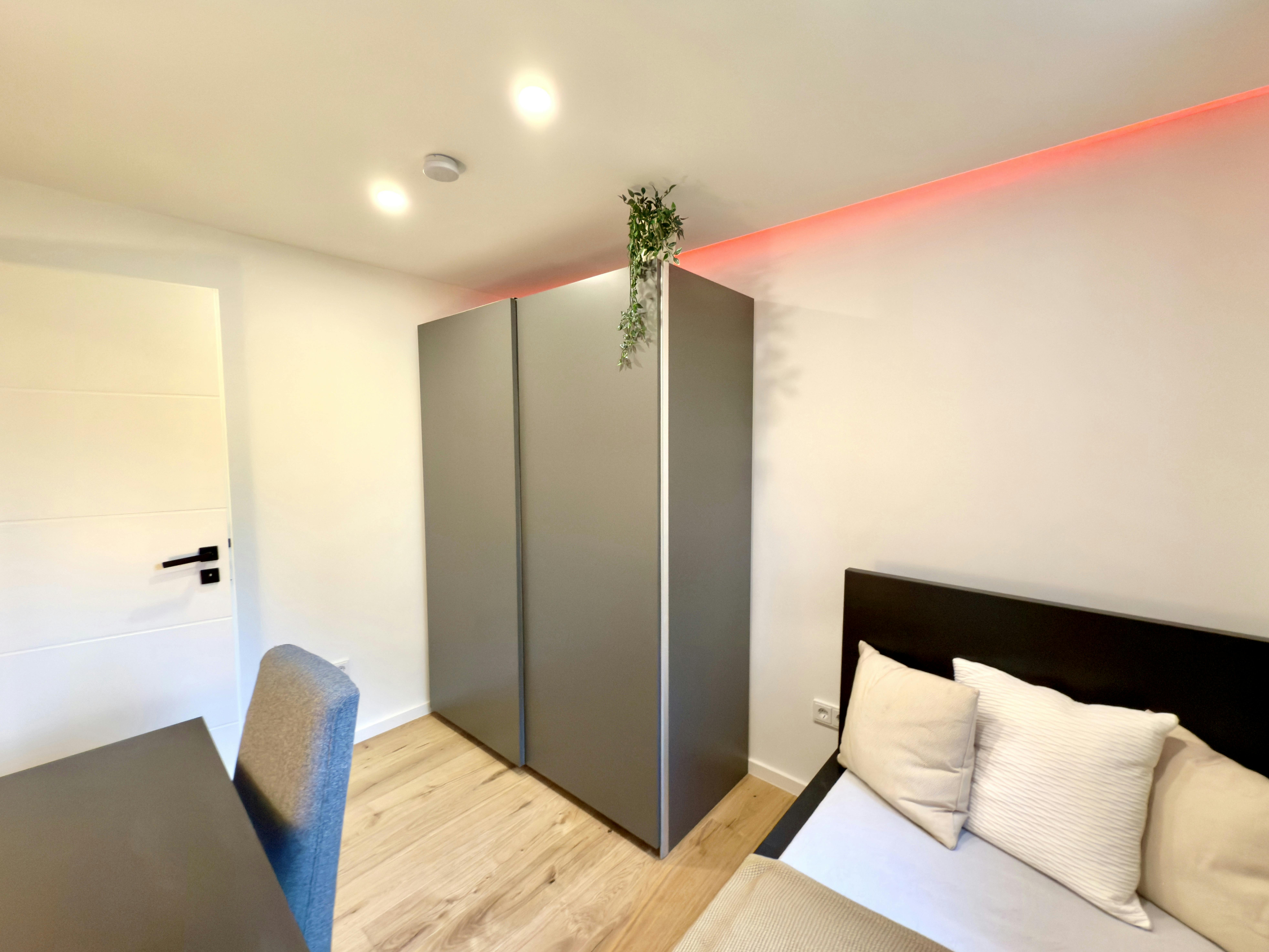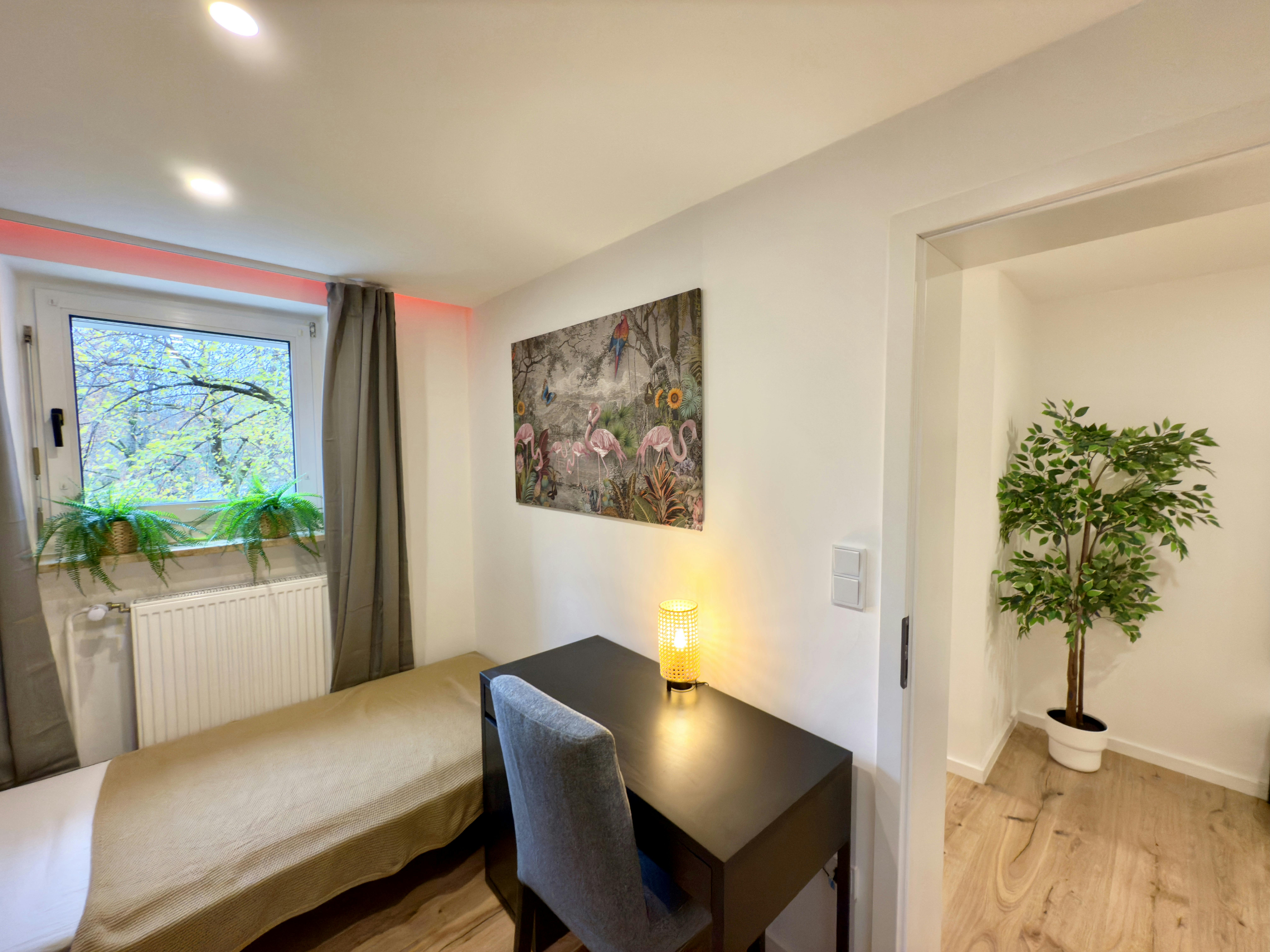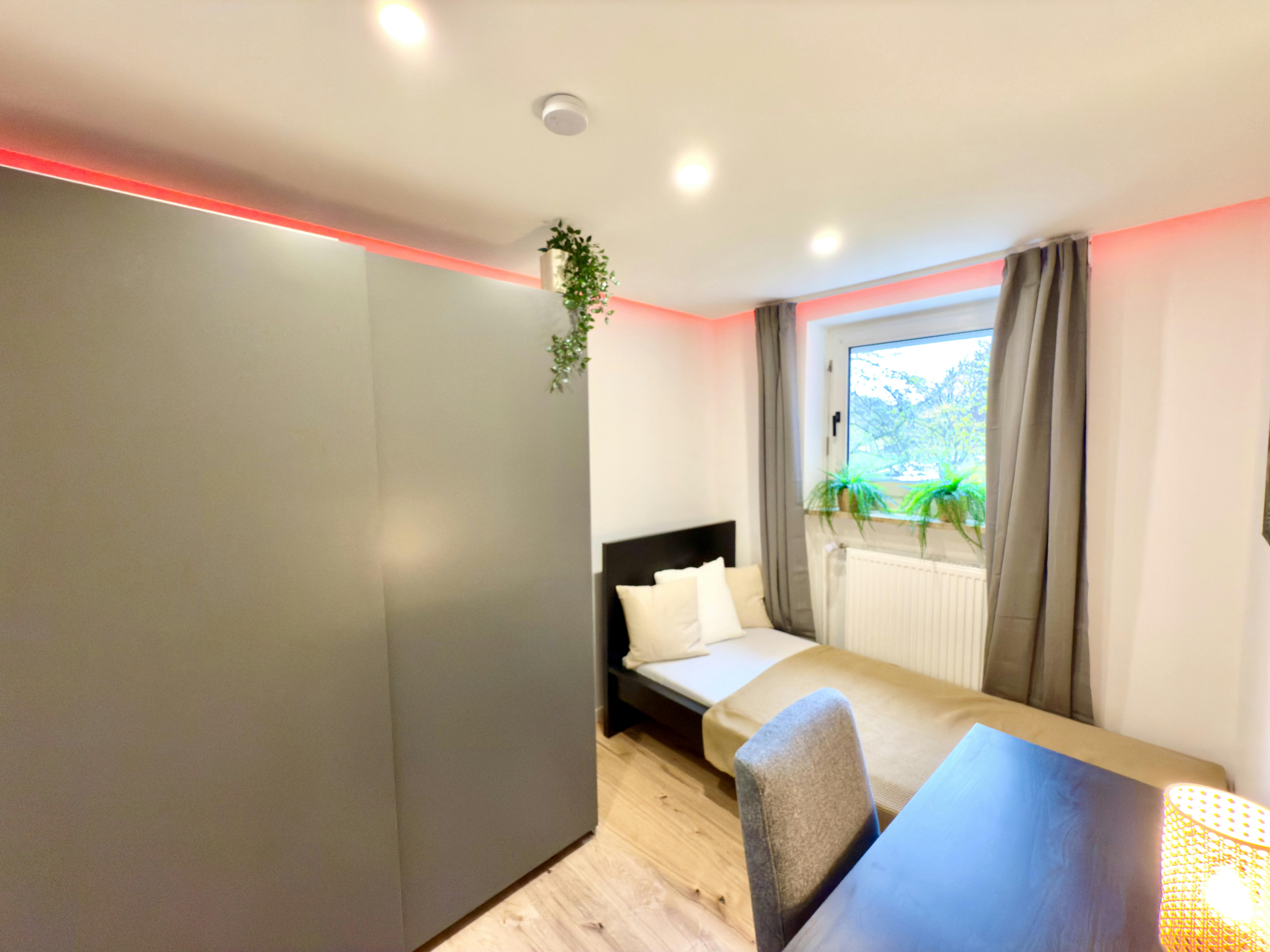 The newly and high-quality equipped room is part of a 90 sqm newly renovated apartment in Munich, Aubing. The next S-Bahn Station is just 5 minutes away. The generous hallway gives a very inviting impression and provides access to all rooms of the large apartment. The apartment also has a newly furnished bathroom, with a washbasin and LED mirror, a towel radiator and a shower as well as a toilet. MATTERPORT (Google Street like) VIEW OF THE APARTMENT: https://my.matterport.com/show/?m=tDCnaihGDRs The comfortably furnished room has the following brand-new furniture: - Bed - Large wardrobe - Desk with drawers and upholstered chair - Chest of drawers - Decorative wall picture The...