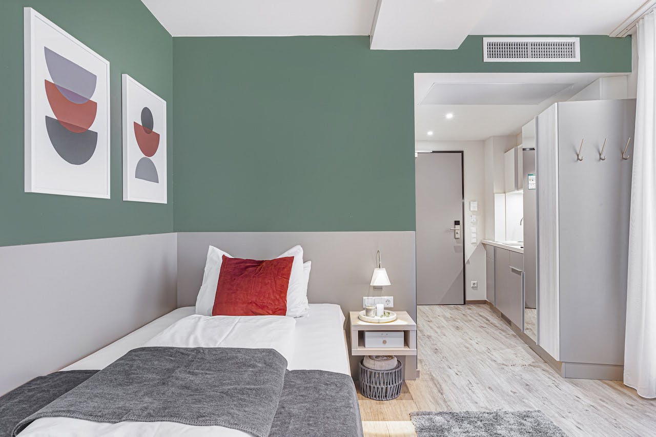Studio apartment is available for rent within a modern service apartment building! ***We provide the registration letter (Wohnungsgeberbestätigung) for the Anmeldung*** A perfect nest to the west of Munich: This cozy studio apartment is located within a modern building, with gorgeous architectural details. Bright, open, and modern, the complex boasts an inviting vibe without forgetting comfort. This is the ideal base for experiencing Munich - a great starting point to explore the rest of the city and its many hidden spots: in 18 min you can be at München Central Station (Hauptbahnhof). The building includes a concierge, gym – with a view,...