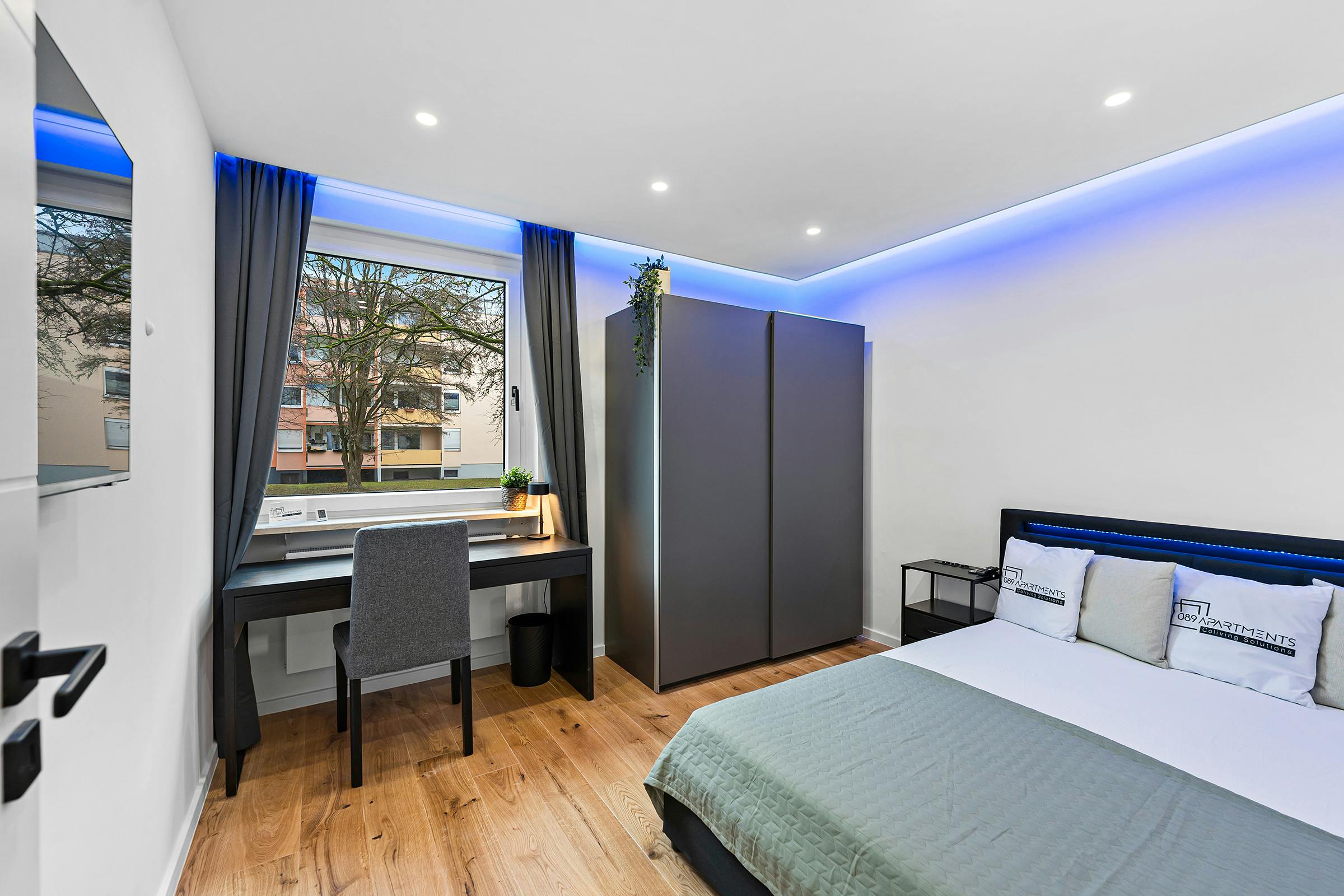 The newly renovated 80 sqm apartment in Munich offers a high-quality living experience and includes a beautifully designed and fully furnished room. You can take a first look at how the finished apartment will appear here: https://my.matterport.com/show/?m=7cYxCFFwsYi Your room is thoughtfully and stylishly furnished with: • A private wall-mounted flat-screen TV (Samsung 43”) • An LED upholstered bed, 140 cm wide (including mattress) with bed table • A large wardrobe with sliding doors and integrated clothes hooks • A desk with drawers, a comfortable armchair, and a waste bin • Suspended ceilings with individually controllable LED shadow gaps (color selectable) • A Munich wall art piece • An additional large mirror and shoe storage compartments in the...