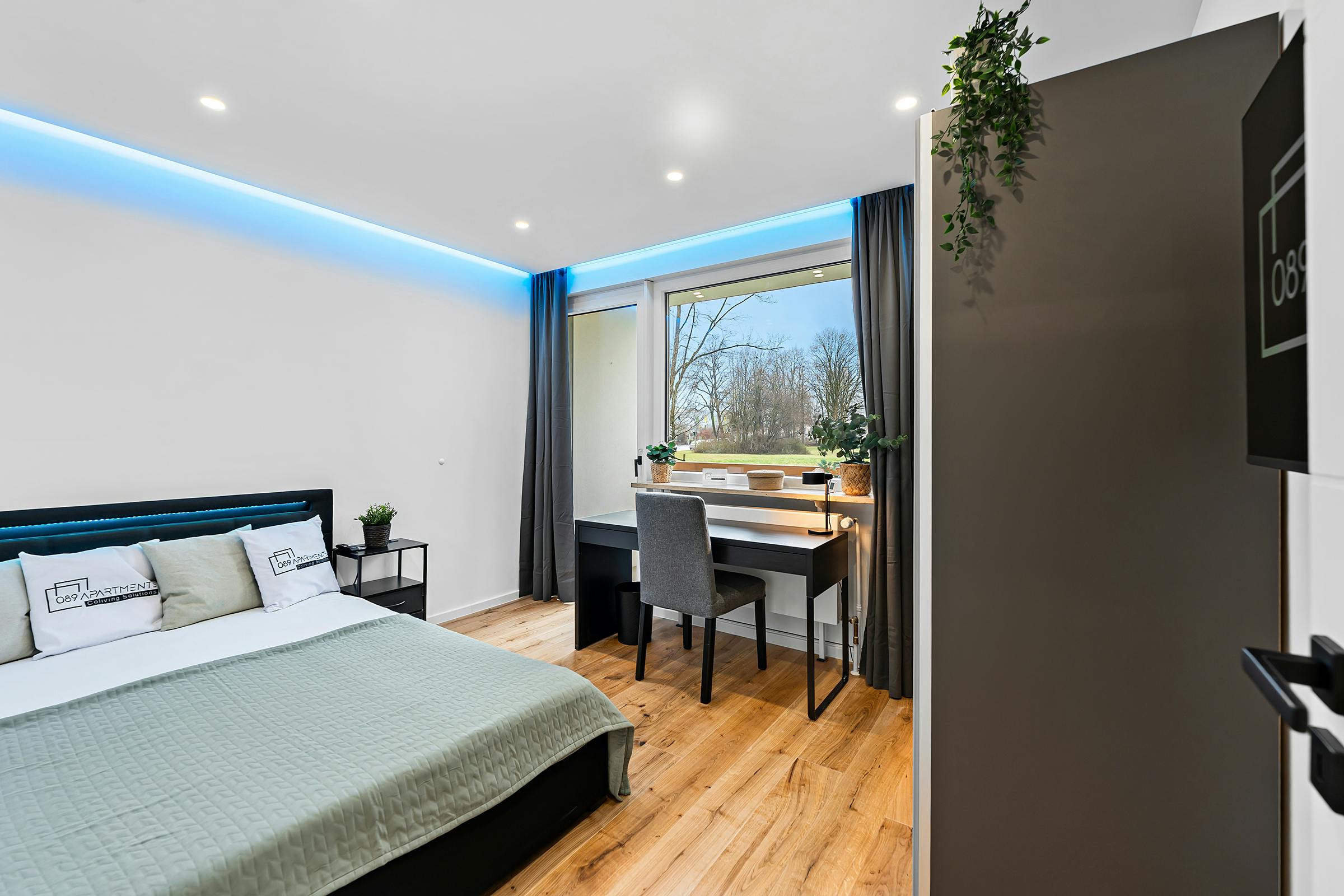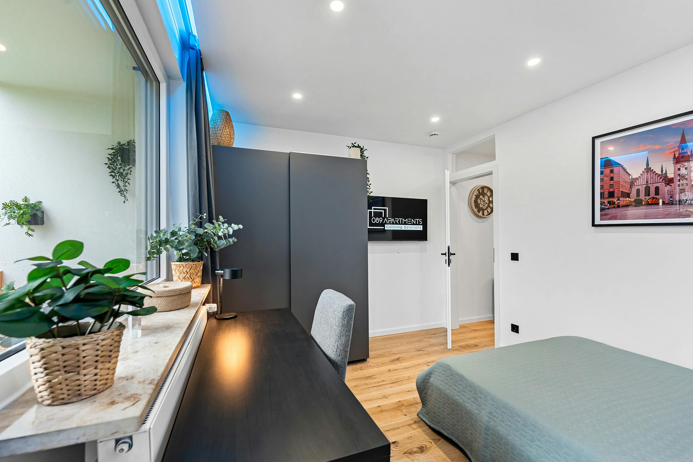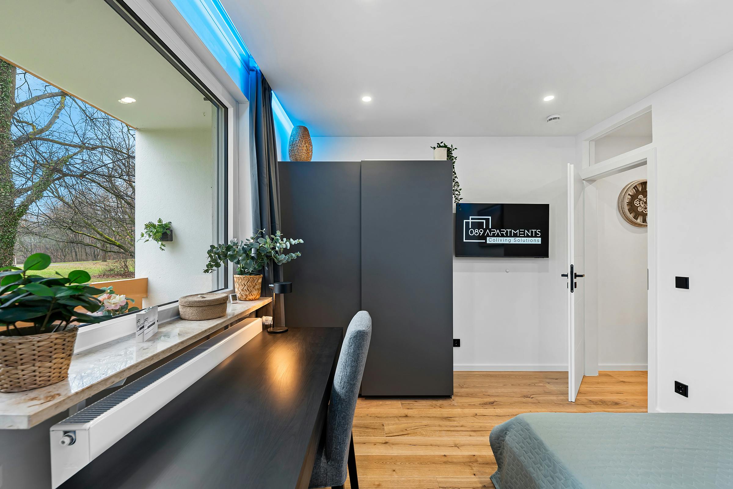 The newly renovated 80 sqm apartment in Munich offers a high-quality living experience and includes a beautifully designed and fully furnished room. You can take a first look at how the finished apartment will appear here: https://my.matterport.com/show/?m=7cYxCFFwsYi Your room is thoughtfully and stylishly furnished with: • Private balcony with lounge furniture and power outlet • A private wall-mounted flat-screen TV (Samsung 43”) • An LED upholstered bed, 90 cm wide (including mattress) • A large wardrobe with sliding doors and integrated clothes hooks • A desk with drawers, a comfortable armchair, and a waste bin • Suspended ceilings with individually controllable LED shadow gaps (color selectable) • A Munich wall art piece • An additional large mirror and shoe...