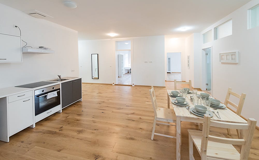 ROOM Our flats fulfil all your daily living requirements. Every flat comes readily equipped with a kitchen, including refrigerator, cooking equipment and dishes. Flats also include a washing machine and Wi-Fi Internet. Each room is fully furnished and offers a comfortable bed with fresh linen and a workspace. The area provides you with several shopping opportunities and excellent connections to public transport.