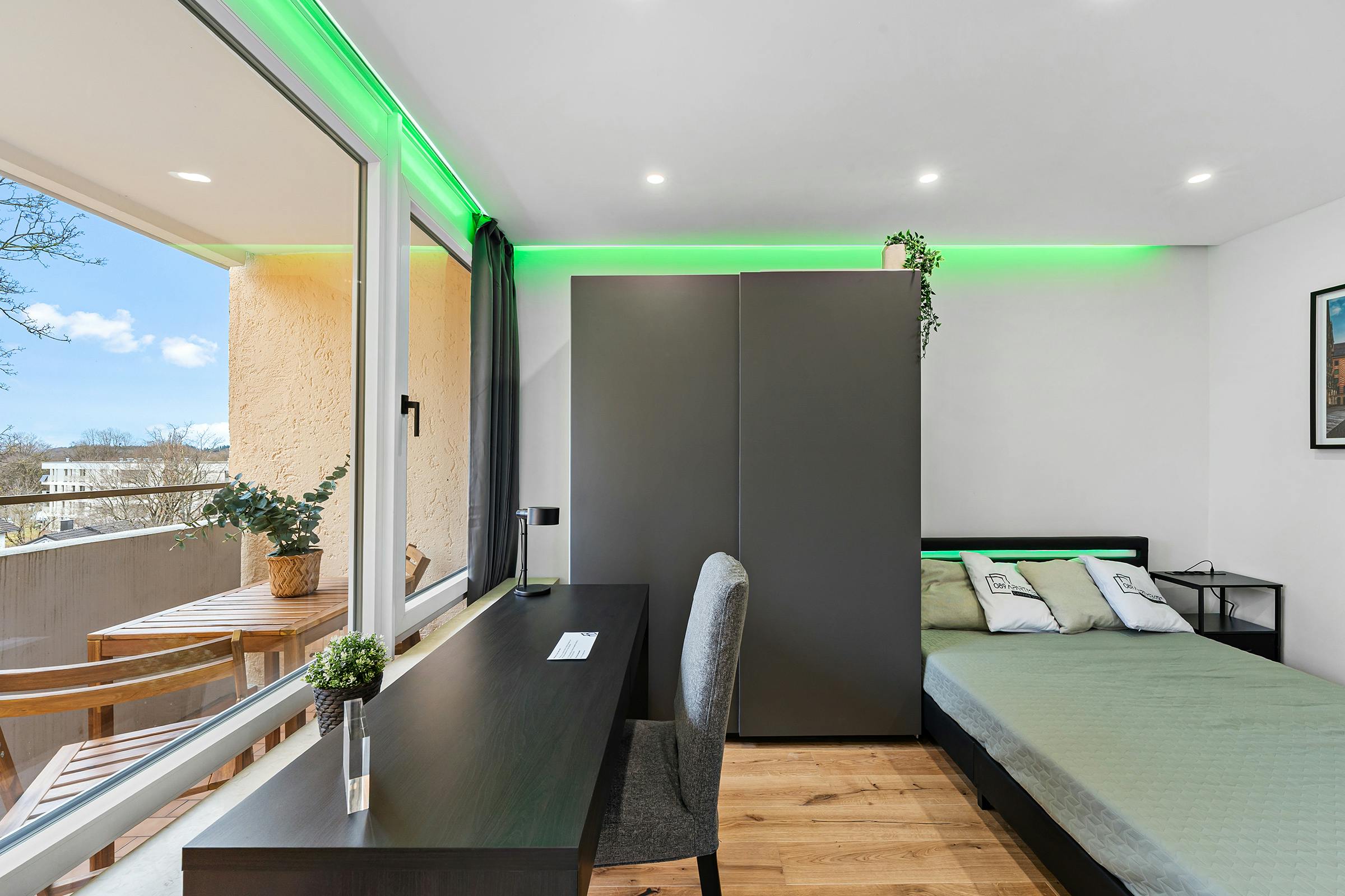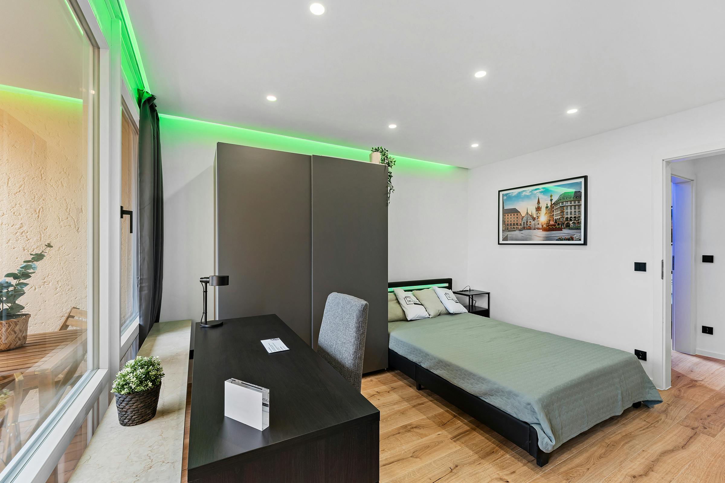 The newly renovated 91 sqm apartment in Munich offers a high-quality living experience and includes a beautifully designed and fully furnished room. You can take a first look at how the finished apartment will appear here: https://my.matterport.com/show/?m=grJx1WSMTSv Your room is thoughtfully and stylishly furnished with: • An LED upholstered bed, 140 cm wide (including mattress) with bed table • A large wardrobe with sliding doors and integrated clothes hooks • A desk with drawers, a comfortable armchair, and a waste bin • Suspended ceilings with individually controllable LED shadow gaps (color selectable) • A Munich wall art piece • An additional large mirror and shoe storage compartments in the hallway Please note: The floor lamps, plants,...