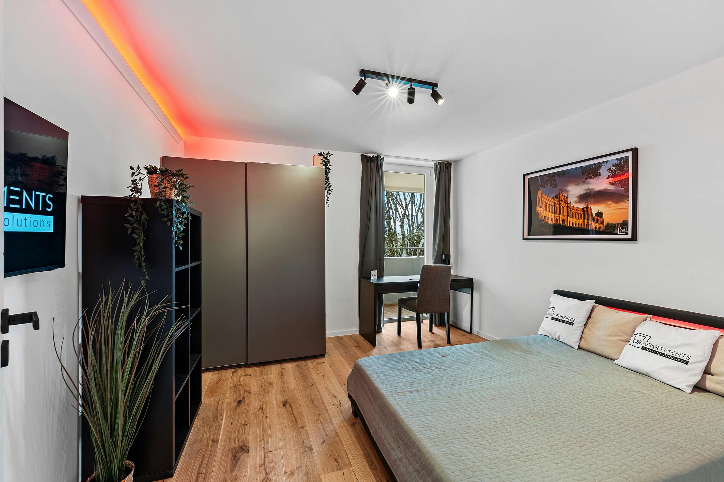 The newly renovated 91 sqm apartment in Munich offers a high-quality living experience and includes a beautifully designed and fully furnished room. You can take a first look at how the finished apartment will appear here: https://my.matterport.com/show/?m=grJx1WSMTSv Your room is thoughtfully and stylishly furnished with: • Private balcony with lounge furniture and power outlet • An LED upholstered bed, 90 cm wide (including mattress) • A large wardrobe with sliding doors and integrated clothes hooks • A desk with drawers, a comfortable armchair, and a waste bin • Suspended ceilings with individually controllable LED shadow gaps (color selectable) • A Munich wall art piece • An additional large mirror and shoe storage compartments in the hallway Please note:...