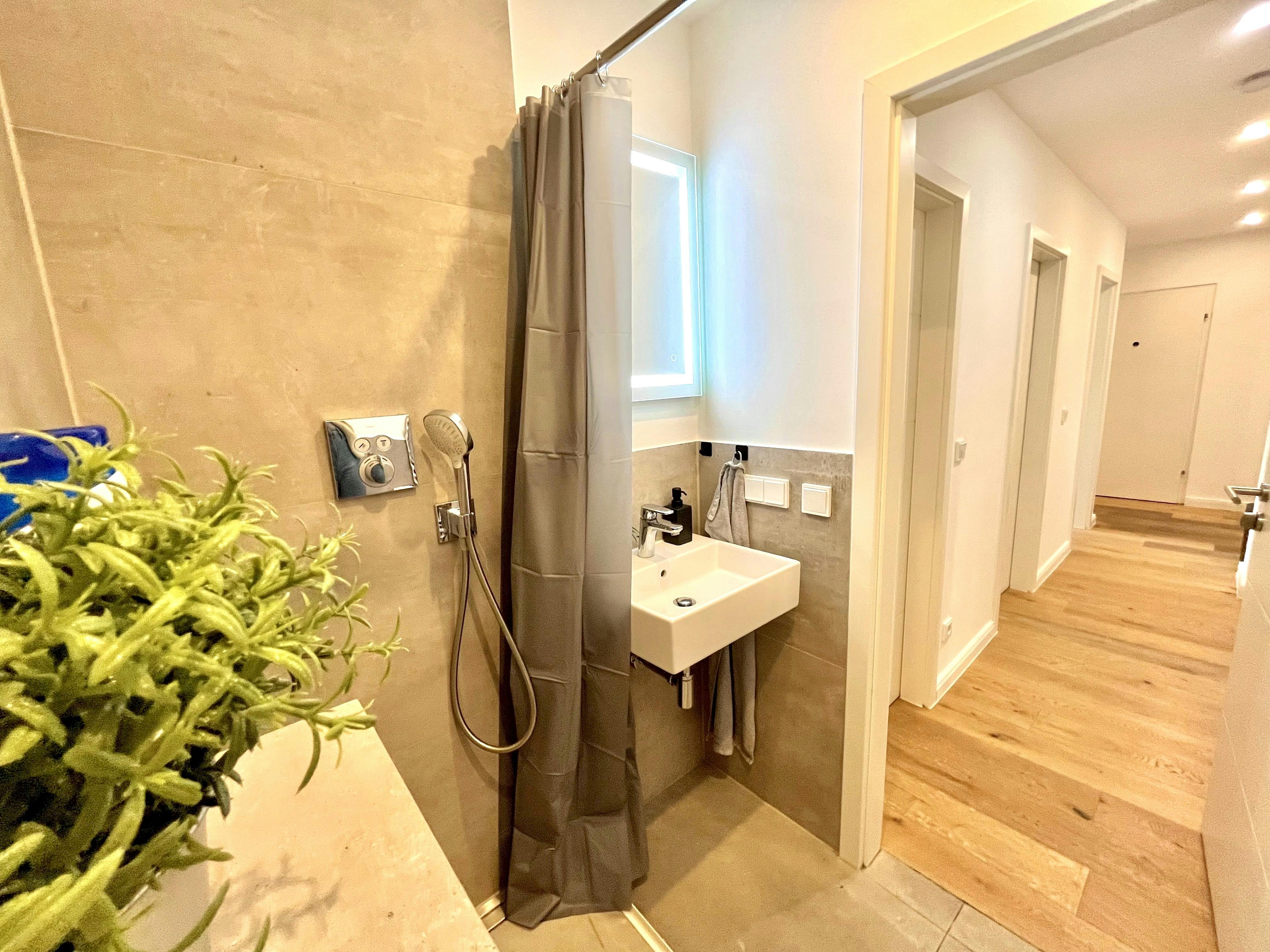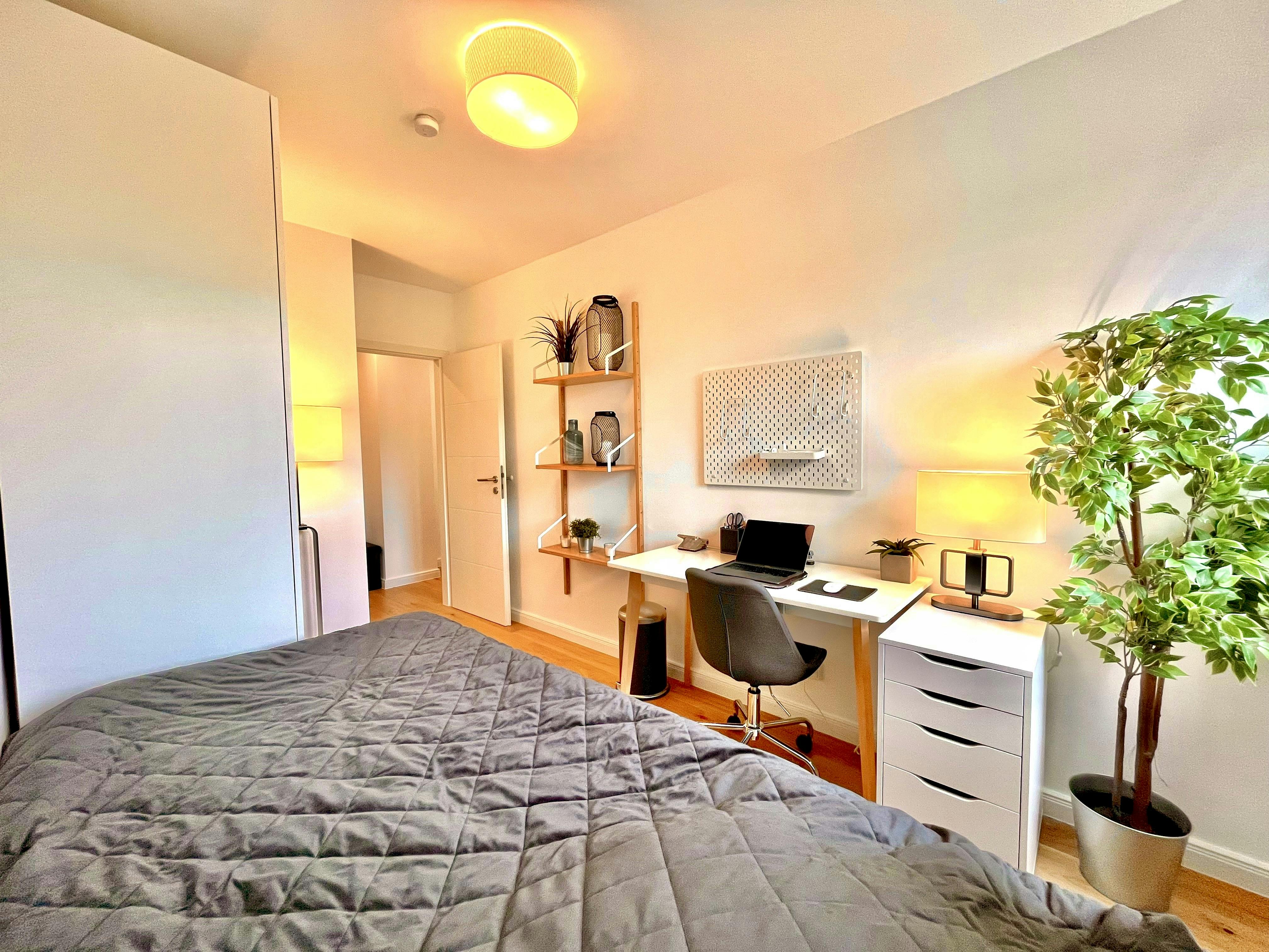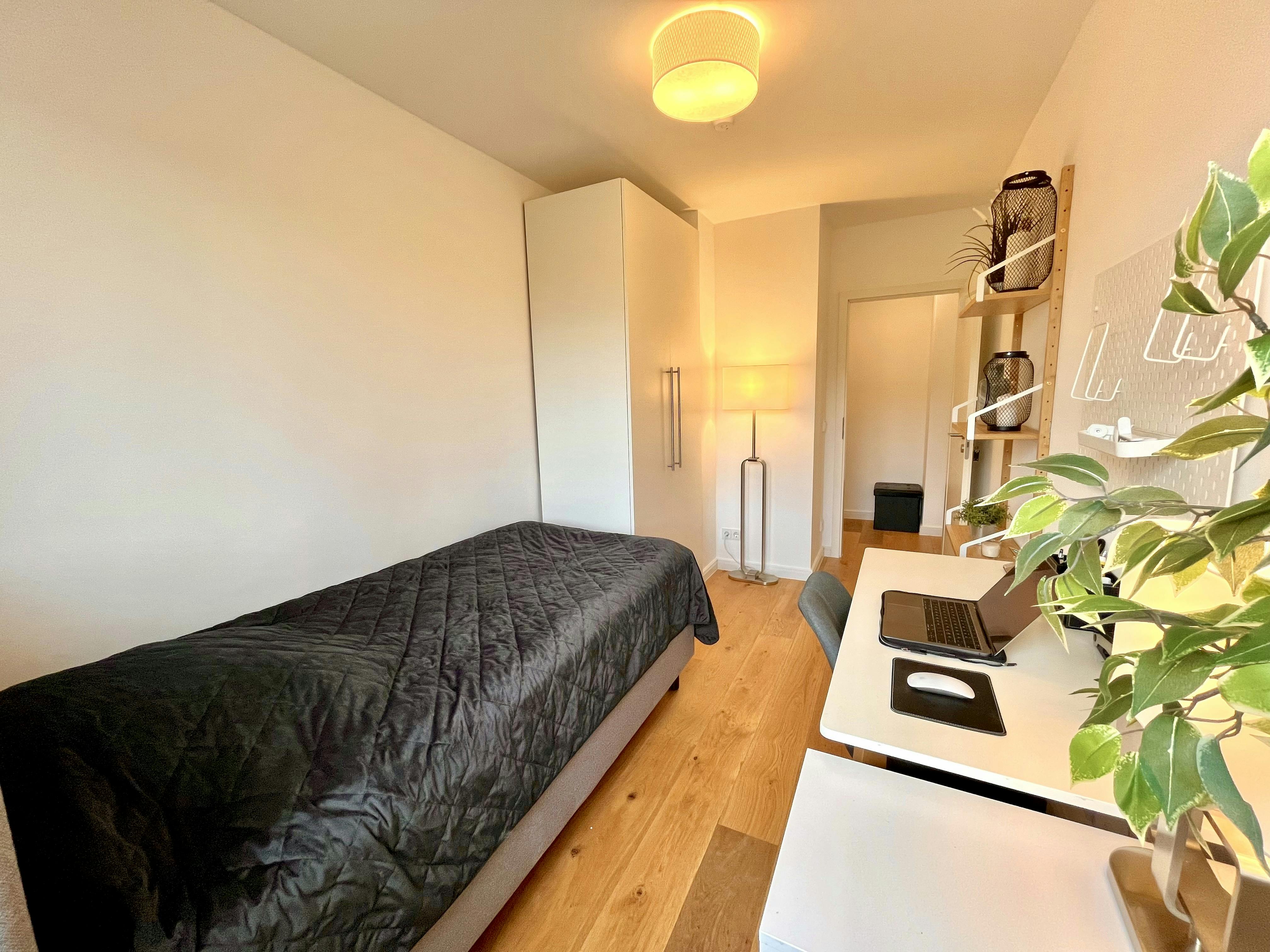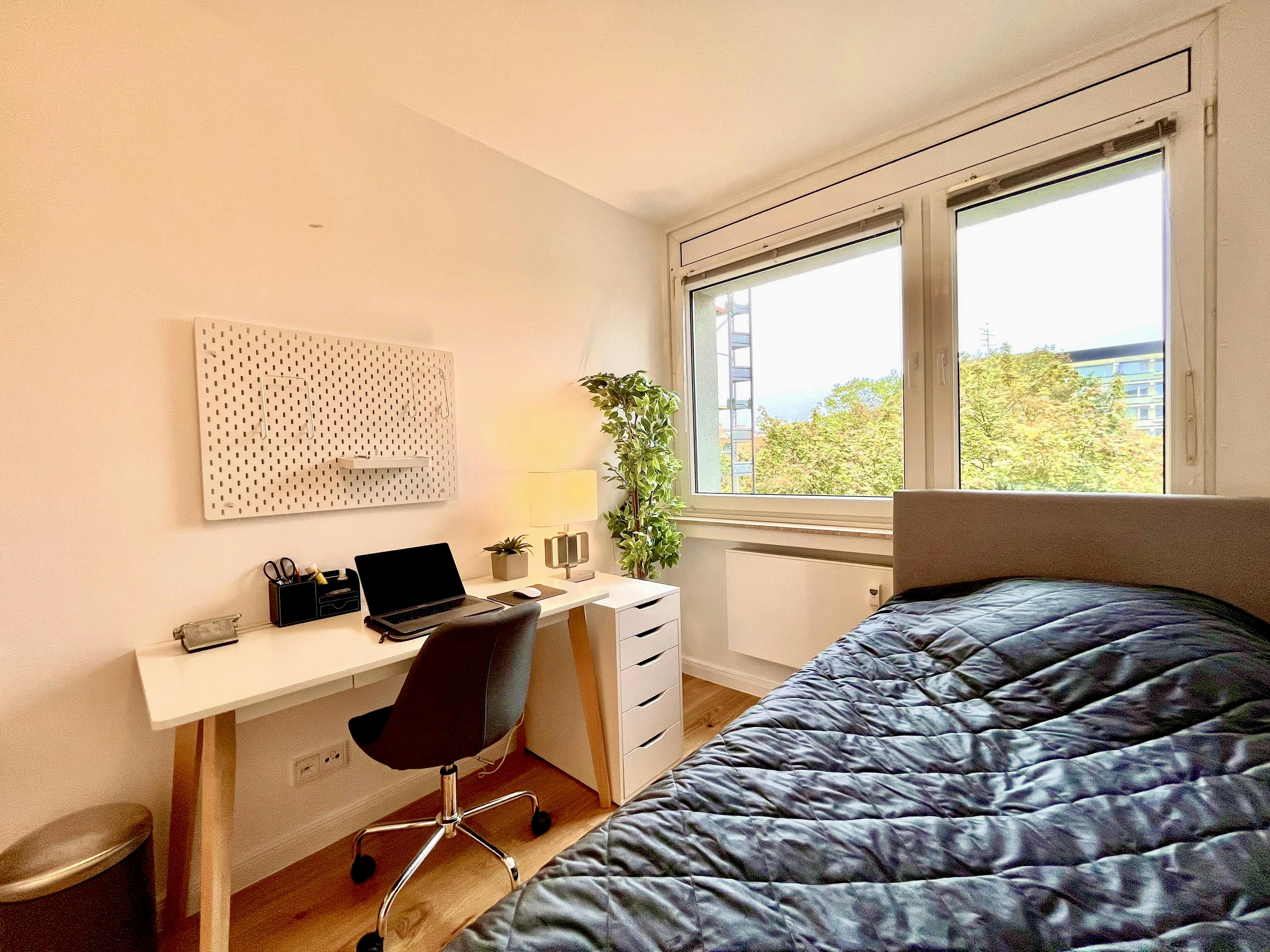 The newly and high-quality equipped room (Room 4) is part of a 75 sqm newly renovated apartment in Munich, Perlach. The generous hallway gives a very inviting impression and provides access to all rooms of the large apartment. The apartment also has a newly furnished bathroom, with a washbasin and LED mirror, a towel radiator, a shower, and a toilet. The comfortably furnished room has the following brand-new furniture: - Bed with mattress - Large wardrobe with drawers - Desk with drawers and upholstered chair The kitchen offers all imaginable conveniences: - All kitchen equipment such as plates, glasses, cookware, etc. - Kettle and toaster - Dishwasher -...