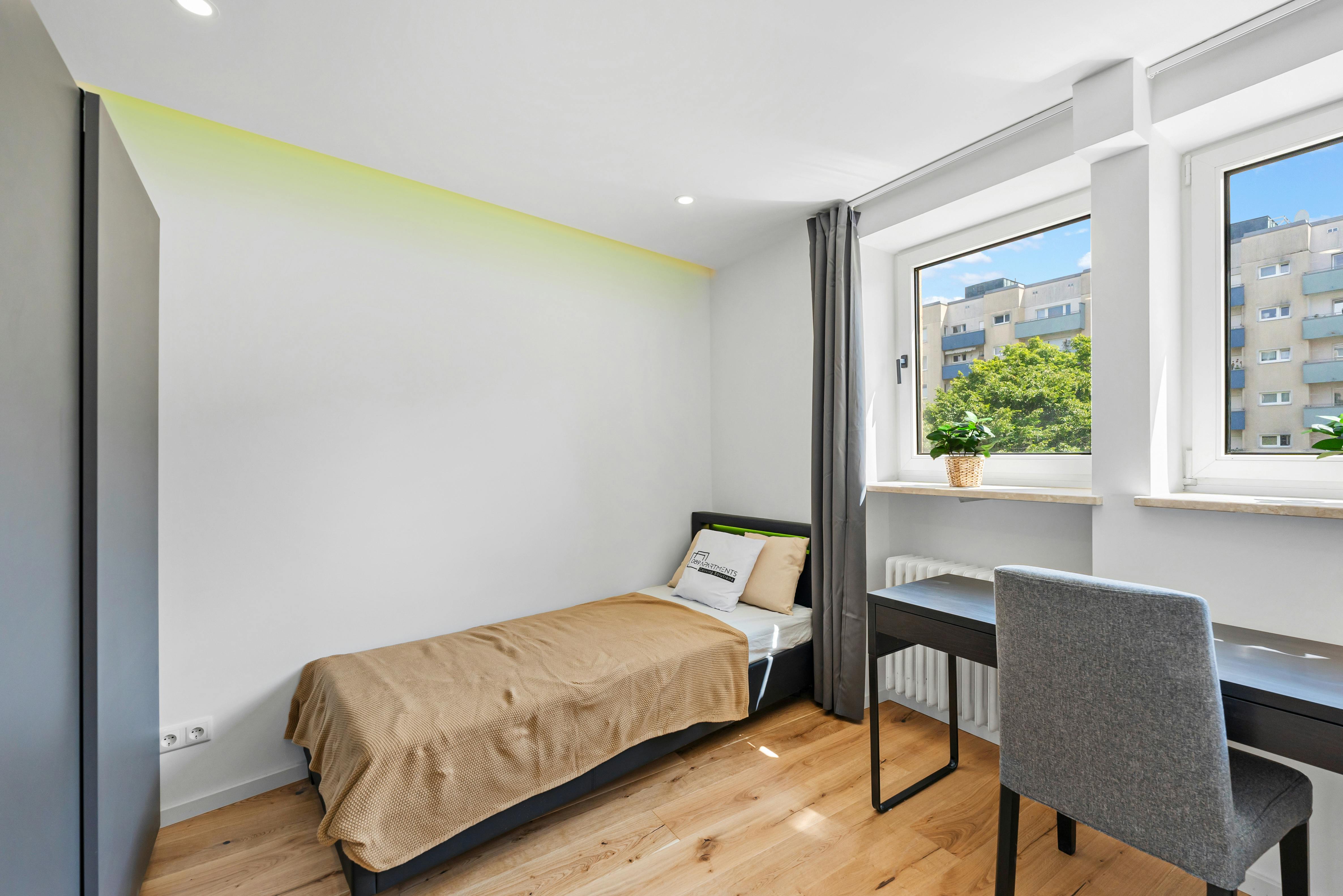 The newly and high-quality equipped room is part of a 75 sqm newly renovated apartment in Munich, Forstenried. The next Bus station is just 2 minutes away. The generous hallway gives a very inviting impression and provides access to all rooms of the large apartment. The apartment also has a newly furnished bathroom, with a washbasin and LED mirror, a towel radiator and a shower as well as a toilet. Get a closer look, how the apartment will look like: https://my.matterport.com/show/?m=gnzjWcf6cTY The comfortably furnished room has the following brand new furniture: - Bed - Large wardrobe - Desk with drawers and upholstered chair - Chest of drawers -...
